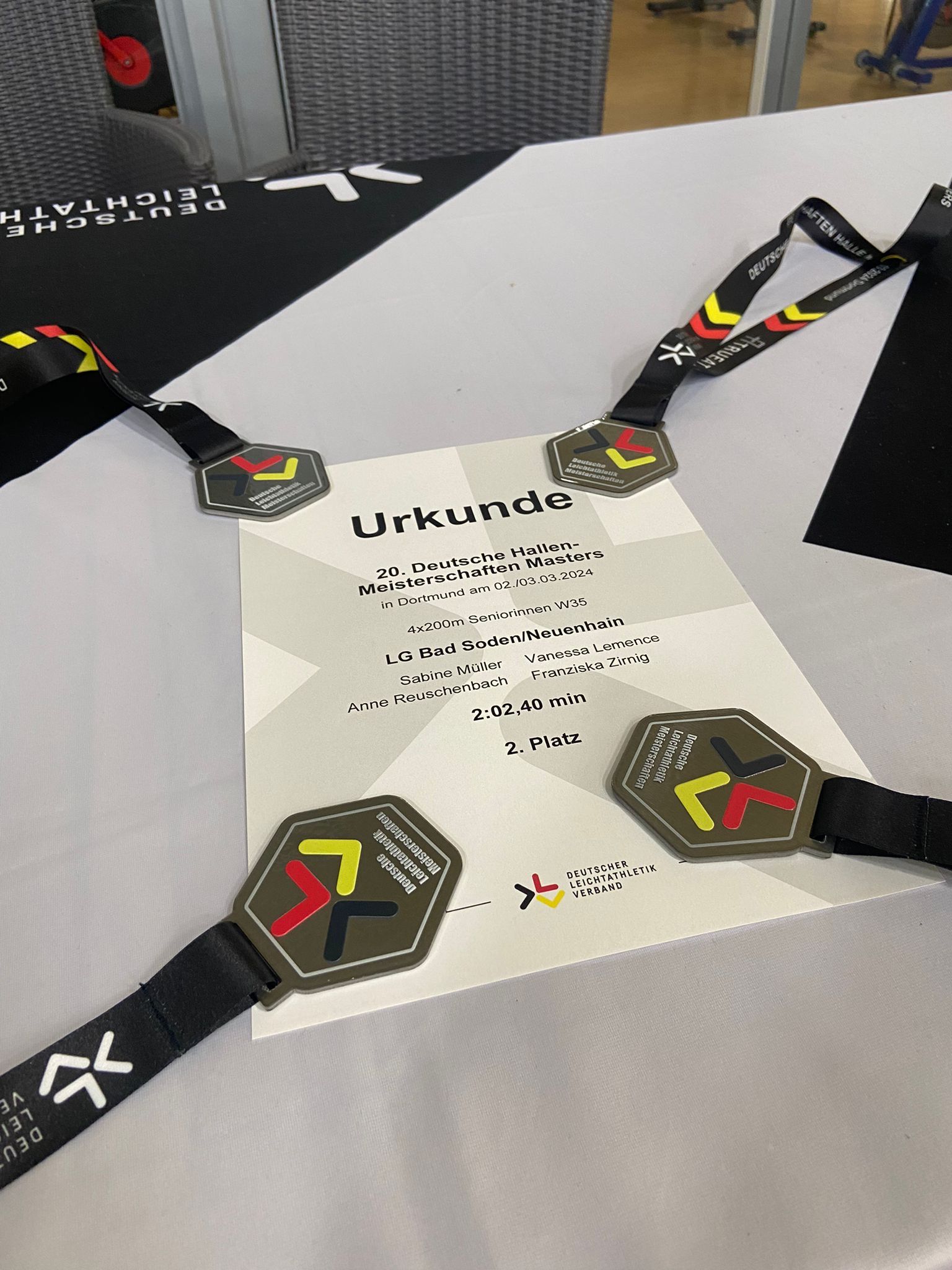 Eine unerwartete Silbermedaille errang die W35 Staffel in der Besetzung Sabine Müller, Vanessa Lemence, Anne Reuschenbach, Franziska Zirnig. Vanessa, für die es der erste Start bei Deutschen Meisterschaften war, konnte ihr Glück kaum fassen, mit einer Medaille nach Hause zu fahren.