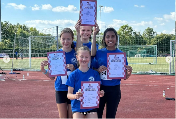 Ganz am Anfang setzte sich unsere Maedelsstaffel eindrucksvoll in Szene und belegte den 1. Platz. Lara Wiedemann (W10), Helena Rom (W11), Sanvi Gupta (W11) und Schlusslaeuferin Valentina Loecher (W11) haben perfekt das Staffelholz gewechselt und sind in einer Zeit von 32,09s ins Ziel geflitzt. Valentina Loecher (W11) war außerdem noch zweimal erste ueber 50m in 8,12s und im Weitsprung mit 3,66m. Ueber 800m (2:57,17min) belegte sie den 2. Platz sowie den 4. Platz im Ballwurf (26,50m).
