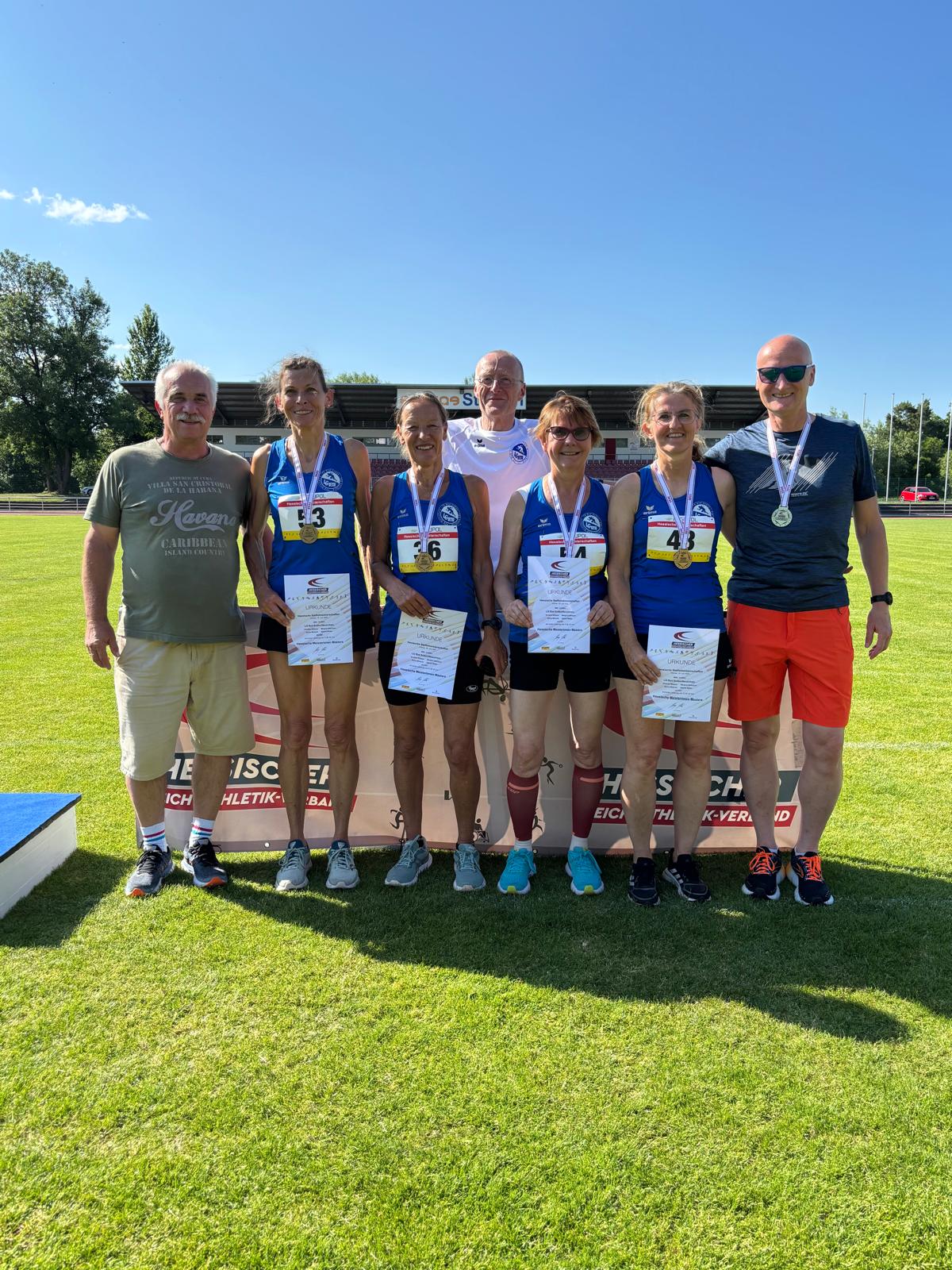 Die 4 x 100 m Staffel der W40 (Vanessa Lemence, Sabine Müller, Anne Reuschenbach, Franziska Zirnig) errang die Golmedaillie. Mit der Zeit von 55,98 sec. waren die Mädels nicht zufrieden, da beim 1. Wechsel viel Zeit auf der Strecke geblieben war.
